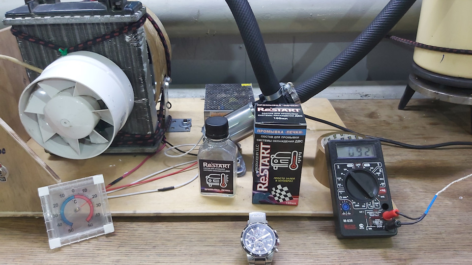 Для наглядной демонстрации промывки печки соорудил простенький стенд, он включает в себя радиатор печки ваз 2101, вентилятор 12в, вентилятор 220в, блок питания 12в, помпа газель 12в, электролита СССР 1квт, и бидон СССР на 5 литров.