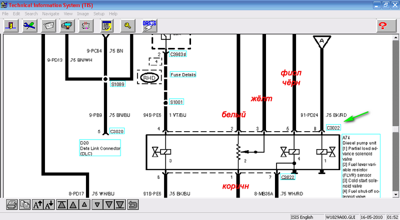 на двигателе вверху действительно написано Endura, топливный насос лукас, но пока на всех схемах, что я нашёл в Ford TIS, в том числе и на Engine control 1,8 l Endura-DE(TC) 29-10-001 везде стоит фишка С3022 , в фишке там 8-й провод красно чёрный. этот красно чёрный провод у меня есть, он сейчас висит, а кондиционера в машине нет!!?? на схеме чёрным написаны цвета проводов, где нехватило скриншота картинки надписал красным из рисунка... она?