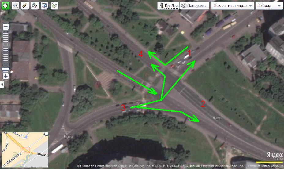 Загорается зеленый. На 3 он без секции, и народ, поворачивая налево, обязан пропустить тех, кто едет справа, то есть, со стороны 1.