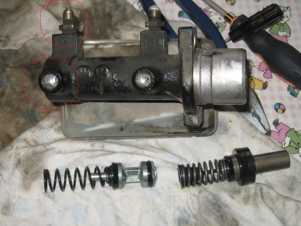 У меня почему то из указанных на рисунке отверстий не течёт жидкость когда прокачиваешь. Из первых двух отверстий, которые я так понял идут на переднее колесо, жидкость брызгает, но когда подключаю трубки системы и откручиваю сливные отверстия передних тормозов, то жидкость еле еле капает, то есть опять таки ГТЦ не создаёт нужного давления, чтоб выдавливать всё с напором. И если на передних хоть что то капает, а по идее должно пшикать с воздухом выходящая жидкость, то на задних вообще ни чего не происходит и это логично, так как, как я и говорил, из отмеченных отверстий для трубок задней тормозной магистрали ПОЧЕМУ ТО!, вообще ни чего не брызгает.