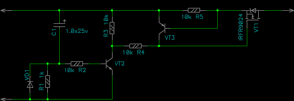 Схема 2. Дополнительно введен каскад на npn транзисторе (например BC547). Результат - намного более резкое вырубание выхода.