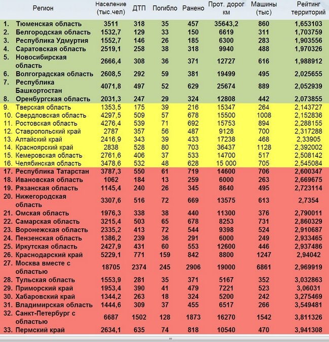 Петербург занял предпоследнее место в рейтинге безопасности дорог за первые два месяца 2013 года. Ниже, на 33-м месте, расположился только Пермский край. Аварии, произошедшие на дорогах Петербурга, считали вместе с ДТП, произошедшими в Ленобласти: за первые два месяца 2013 года на дорогах двух регионов произошло в общей сложности 1 502 ДТП, в которых 128 человек погибли. Петербург и Ленобласть заняли предпоследнее место в рейтинге безопасности дорог за январь-февраль 2013 года, составленном межрегиональным общественным центром «За безопасность российских дорог». Петербург и область заняли в рейтинге 32-е место. Ниже, на 33-м месте, расположился только Пермский край. За первые два месяца 2013 года на дорогах двух регионов произошло в общей сложности 1 502 дорожно-транспортных происшествия, в которых 128 человек погибли и 1 873 были ранены. Москва и Московская область оказались в рейтинге на 27 месте, при том, что там в 4,5 раза больше автомобилей, чем в Петербурге и Ленобласти (6,9 млн автомобилей против 1,5). Возглавляет рейтинг безопасных дорог Тюменская область. В тройке лидеров также оказались Белгородская область и Удмуртия. «Нынешний рейтинг показывает, что регионы, где Госавтоинспекция и органы власти имеют принципиальную позицию и не жалеют сил для обеспечения безопасного движения на зимних дорогах, оказываются на верхних строчках таблицы», – пояснил глава центра «За безопасность российских дорог» Дмитрий Леонтьев. Вложение: http://www.mr7.ru/articles/80364/ |