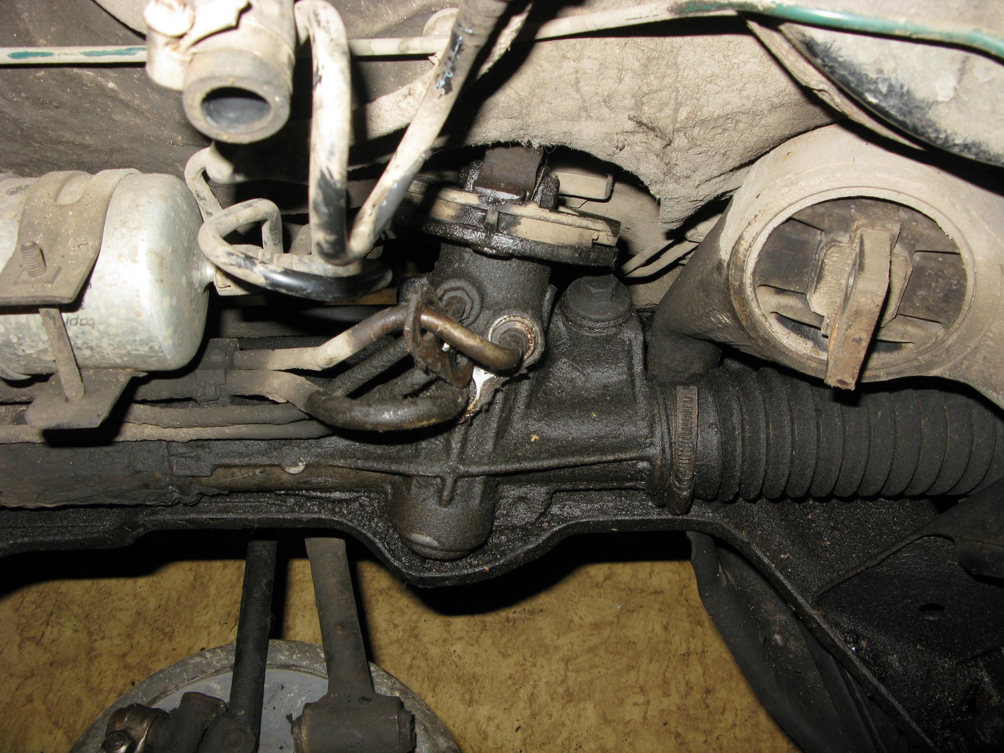 4. Рулевая рейка свободна - откручены трубки (об этом не писал отдельно), рулевые тяги, демфер вибраций с вала снят, два болта крепления рейки к кузову откручены - извлекаем рейку.