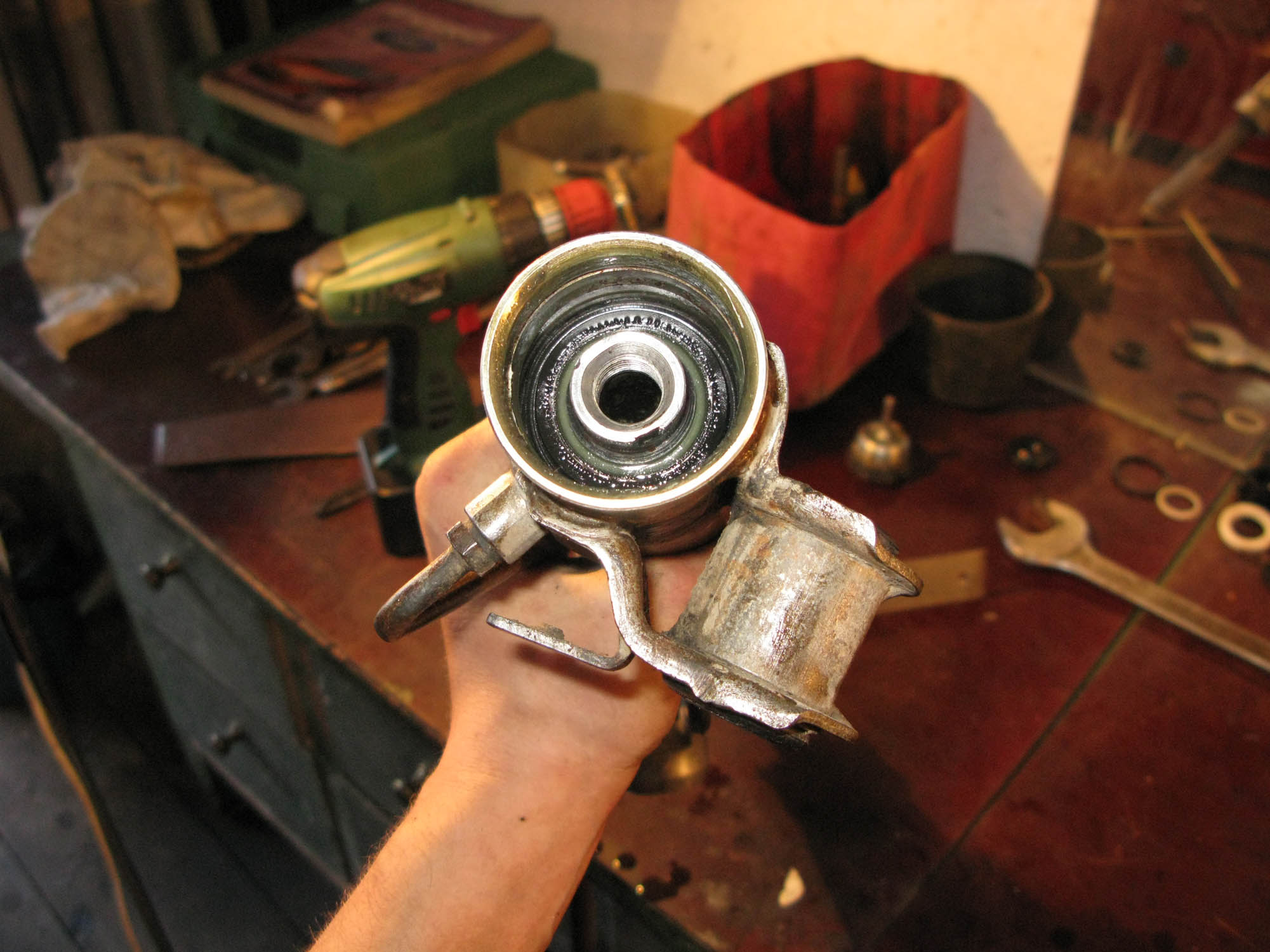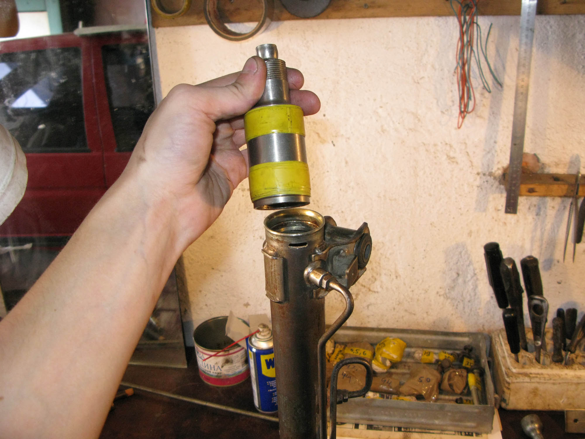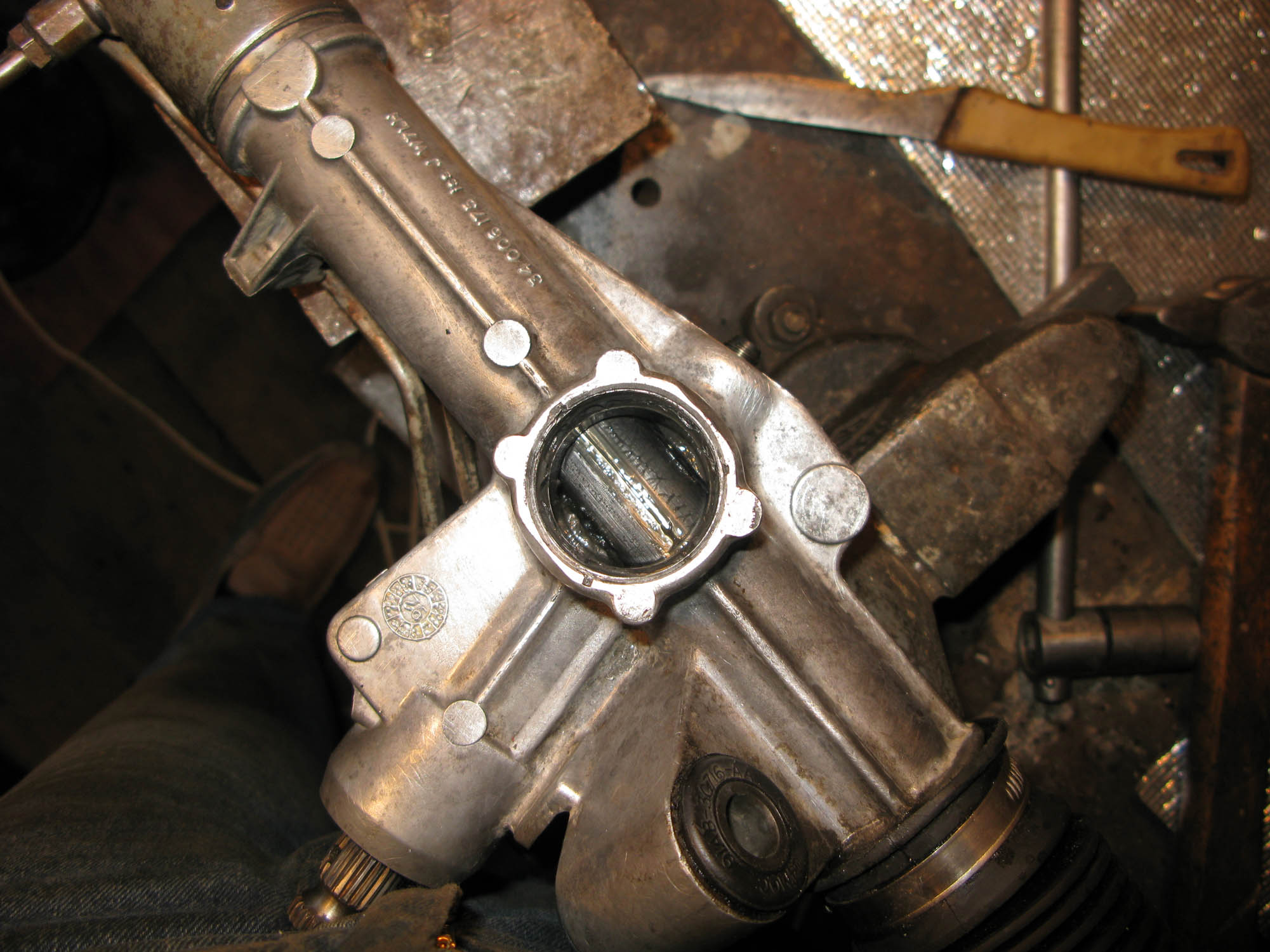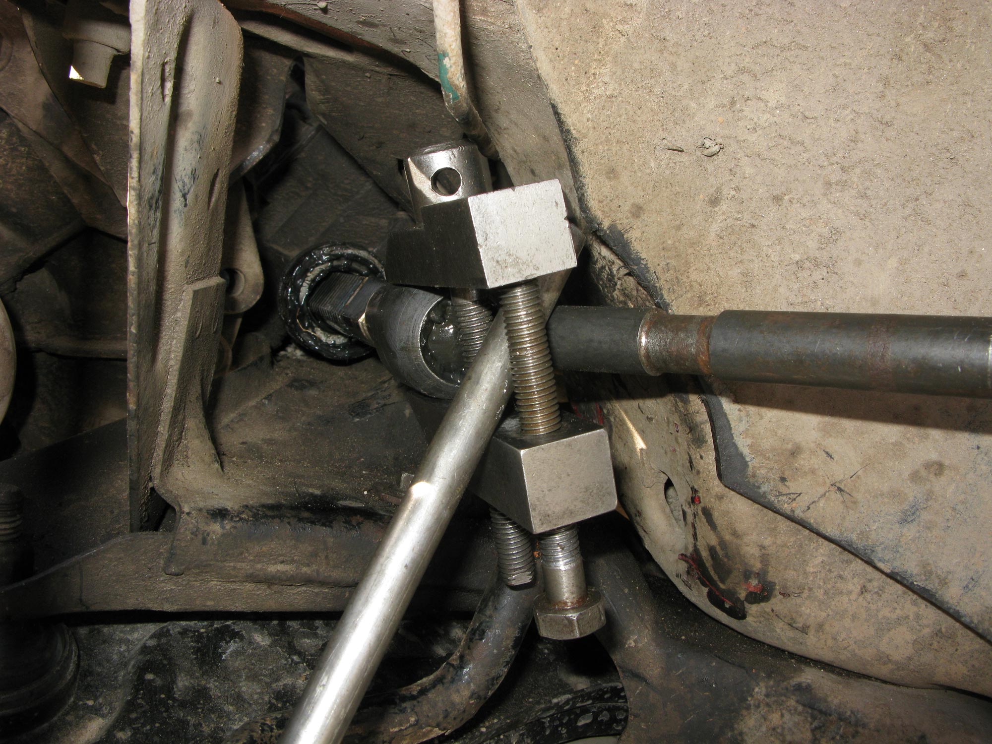 Итак, начинаем. 1. Сначала необходимо снять рейку с автомобиля. Лично я рекомендовал бы для этого предварительно открутить от неё рулевые тяги. Когда я снимал рейку, двигатель тоже был снят, и подобраться к рейке было легко, но, несмотря на это, рулевые тяги всё же мешали нормально извлечь её, поэтому рекомендую их отсоединить. Для этого откручивает рулевой наконечник от рулевой тяги, а саму тягу, если на неё нет шлицов под ключ (на моих старых тягах - не было. На новых, покупных - были) можно использовать такую вот струбцинку, как показана на фото 5748 и 5749. Фото сделано при съёме левой тяги - к ней подобраться сложнее, чем к правой, и я смог стронуть её только при помощи такой струбцины - никаким ключом туда не подлезть. Однако такую струбцину можно купить в любом автомагазине, поэтому никаких проблем не должно возникнуть.